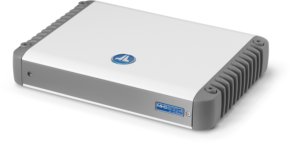 This marine amplifier features white and gray powder-coat finishes, a gasketed cover for the controls and stainless steel hardware for durability in the marine environment.