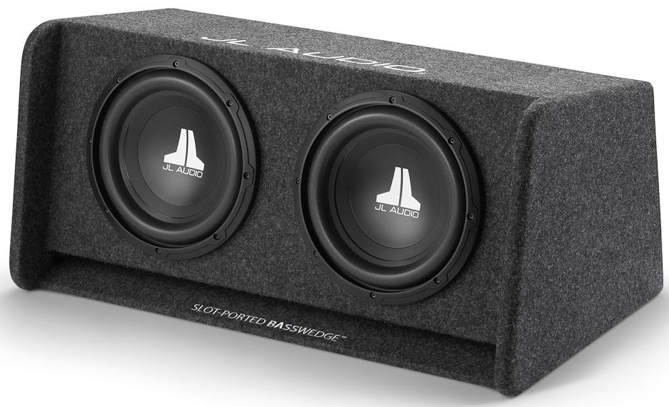 Finish: Dark gray, high-grade automotive carpet with "JL AUDIO" embroidery on the top edge and "Slot-Ported BassWedge™" embroidered on the port mouth.