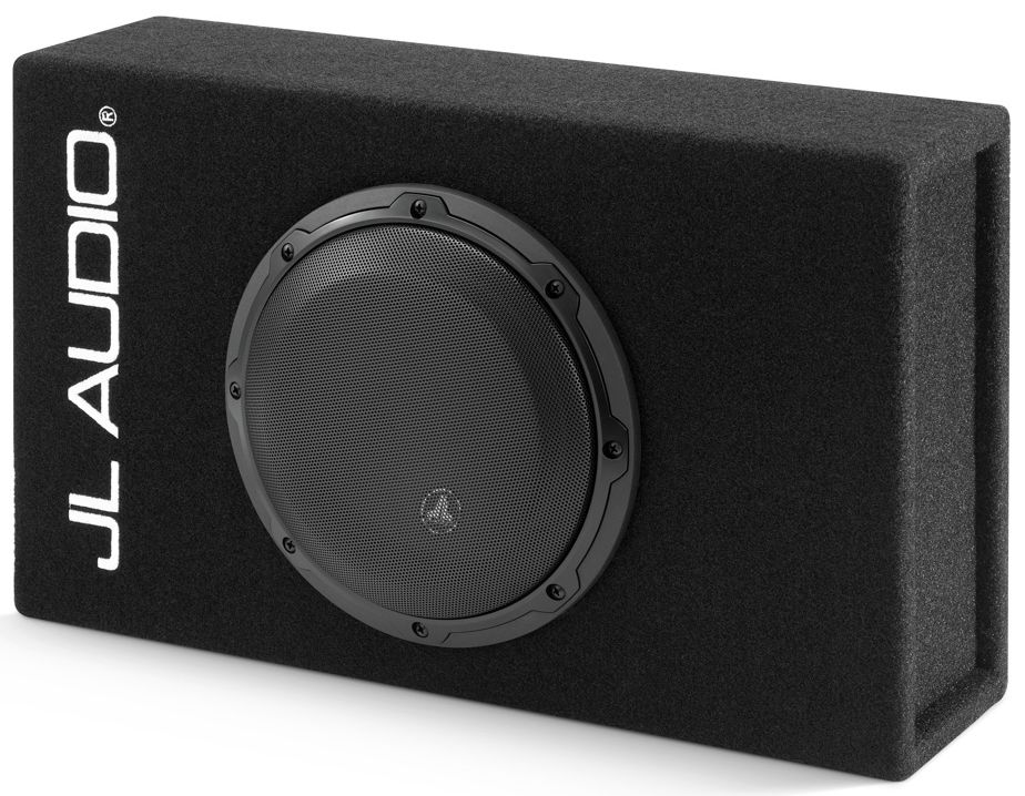 Finish: Black, high-grade automotive carpet with silver "JL AUDIO" embroidery on front baffle. A steel mesh grille is included to protect the subwoofer driver.